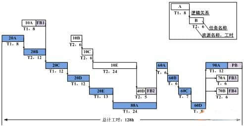 缓冲分为时间缓冲(TB)和资源缓冲(RB),时间缓冲又可以分为汇入缓冲(FB)和项目缓冲(PB)。汇入缓冲(FB)用于保护非关键链,其插入位置为非关键链和关键链的交接处;项目缓冲(PB)用于保护关键链,位于关键链的末端。对于资源缓冲(RB),一般情况下我们不进行缓冲设置,只需要在瓶颈资源使用前一段时间发出预警,提示项目经理即可。而对于时间缓冲,可以按照砍半法、剪切法、根方差法等方法设置缓冲。如下图是一个插入缓冲的关键链网络计划图。
