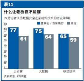 《经济学人》的报告还显示,尽管企业的一把手对新技术的应用充满热情,但仍对数据安全问题忧心忡忡。约四分之三的董事会成员/首席高管将数据安全视为采纳云计算及大数据分析的一个潜在障碍。就移动数据而言,该数据较低,仅为65%,但仍然是非常大的比例。但对于企业的部门主管来说,他们并不会将数据安全视为新技术应用的潜在障碍,但与其他部门的同事相比,IT部门以及金融/审计职能部门(分别是负责数据安全而且其工作与敏感信息紧密联系)的人员明显地更为关心数据安全问题。