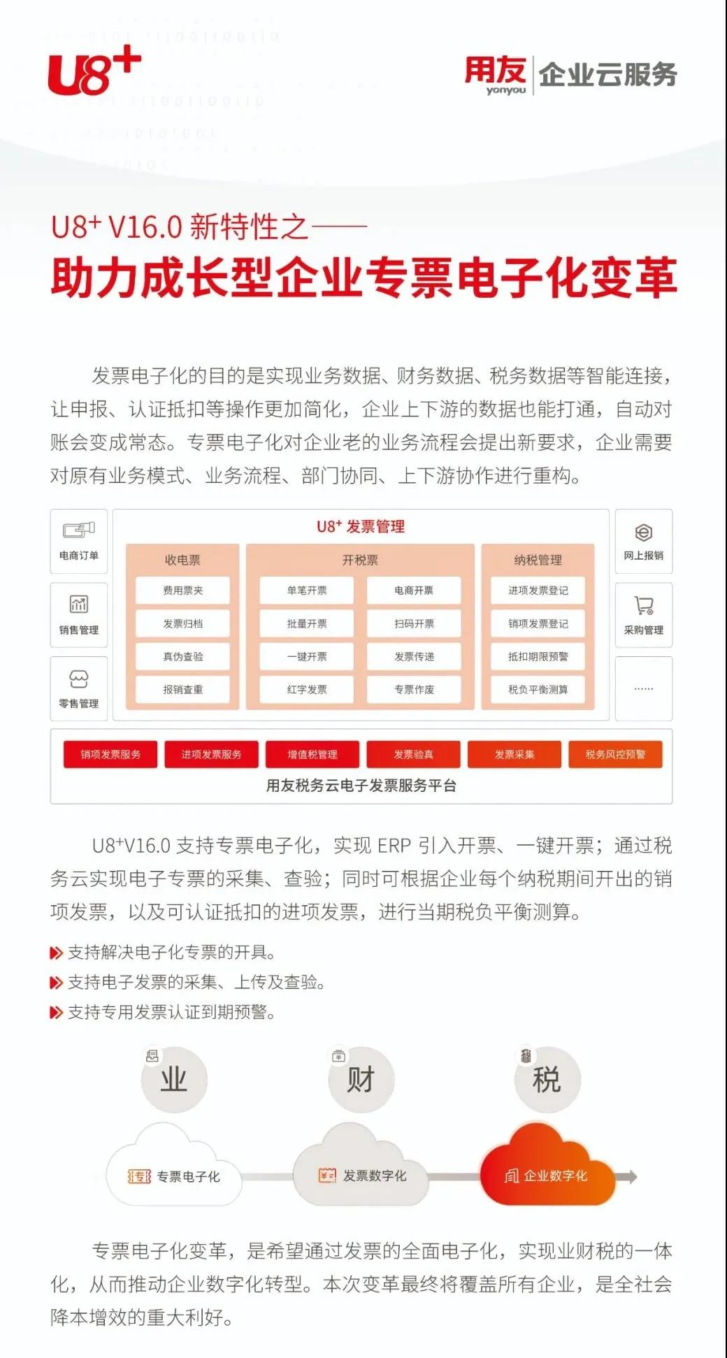 用友U8+给广大成长型企业提出的,就是这种第三方电子发票服务平台的解决方案。通过用友提供的电子发票服务平台,打破了企业在电子化、数字化转型上的一个瓶颈,将企业电子化、数字化的最后一公里打通,从专票电子化到发票全面数字化,进而推动企业财税工作的数字化。