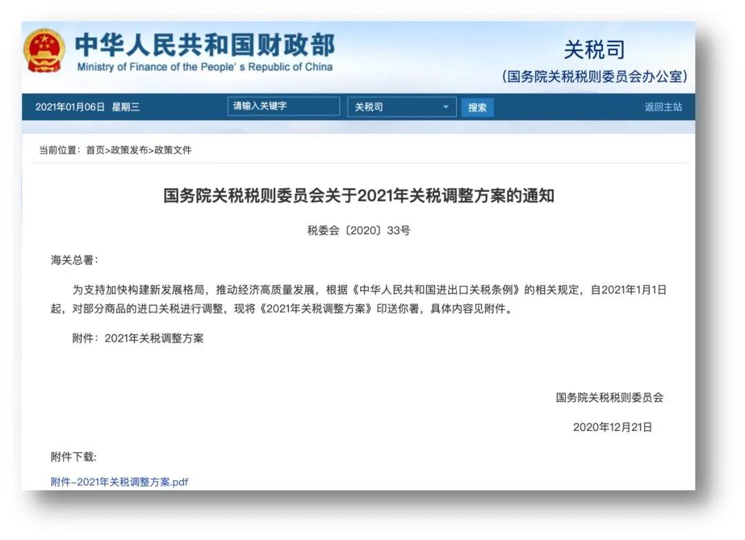 2020年12月23日下午,国务院关税税则委员会发布【关于2021年进口暂定税率等调整方案的通知】,2021年将调整部分进口商品的最惠国税率、协定税率和暂定税率。自2021年1月1日起,对部分商品的进口关税进行调整;支持一些抗癌药、医疗器材、婴儿奶粉的价格下降,与新基建和高新技术产业发展相关的部分进口设备以及零部件将有更充足的保障。