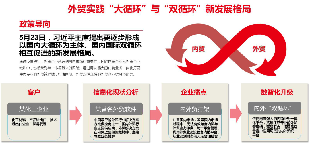 2021年,随着外贸新规的推出,RCEP贸易协定的各项措施逐步落地,世界经济有望复苏带动贸易增长,国内经济恢复平稳增长也给外贸发展提供了有力支撑,随着以国内大循环为主体、国内国际双循环相互促进的新发展格局加快形成,高水平对外开放不断推进,新的国际合作和竞争新优势不断形成,企业需要在这波浪潮中,加速企业的数智化转型,快速适应新规,提升企业管理数字化水平,享受政策环境与经济环境赋予的红利。