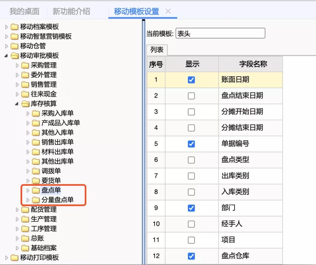 移动模板设置中增加盘点单、分量盘点单的移动审批模板设置,用于设置移动端审批时显示的模板内容。