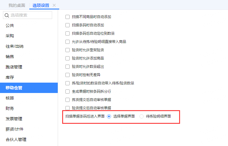选项设置中设置扫描单据条码进入的界面;