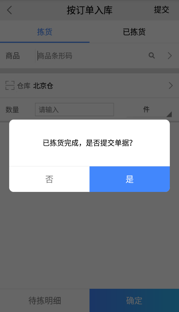 拣验货完成后,系统会自动提示已经拣货完成,并可点提交的按钮直接提交。