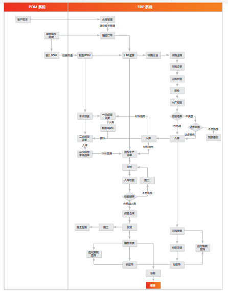 技术部在 PDM 系统中可以将材料清单及 BOM 清单导入 ERP 系统的产品档案及制造 BOM,减少了重复工作,并保证了数据的一致性 和完整性。同时,通过 PDM 变更管理来有效控制设计中的工程更改。