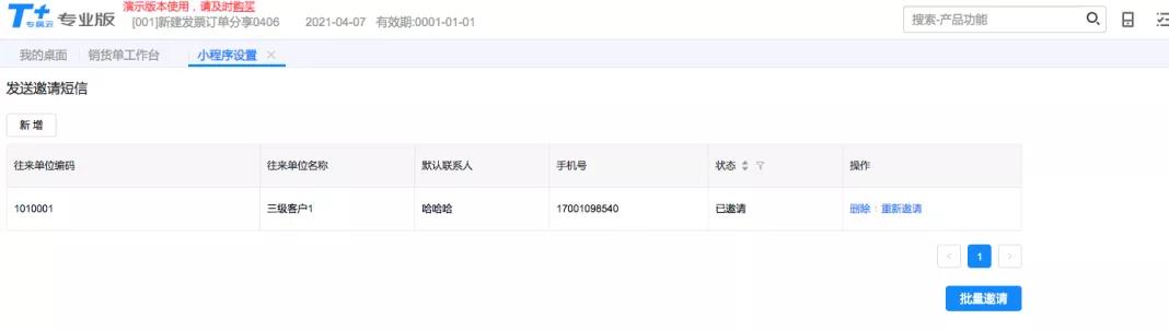企业可以根据需要,发送邀请信息,邀请客户登录小程序,查询自己的订单、销货单等信息。